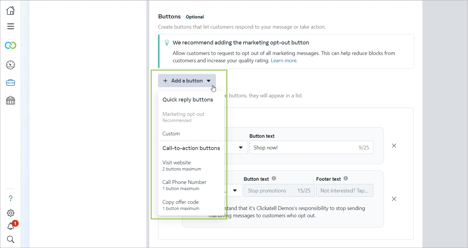 Previously, Clickatell only supported one type of interactive button per template, i.e., either call-to-action buttons or quick reply buttons, not both. You could also add only three buttons per template.
