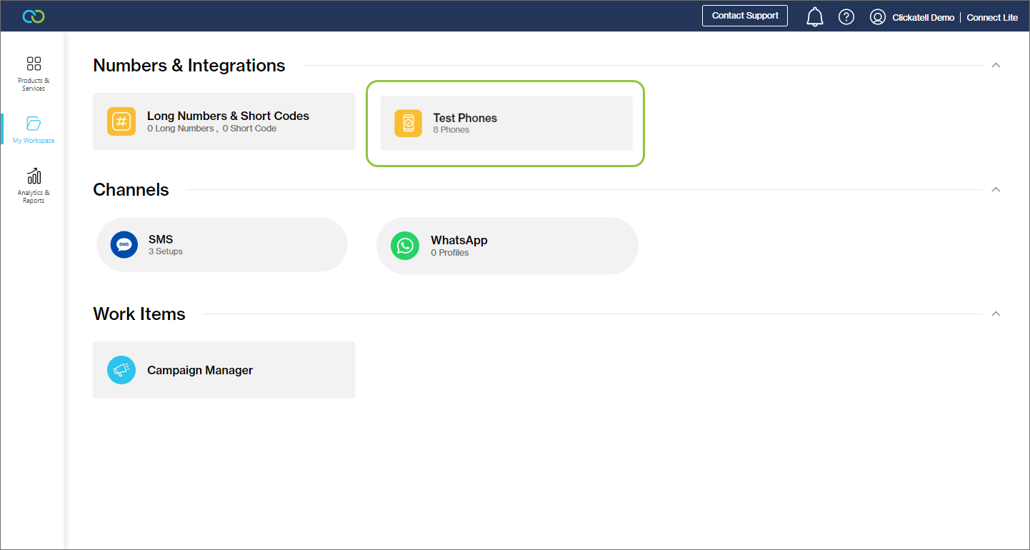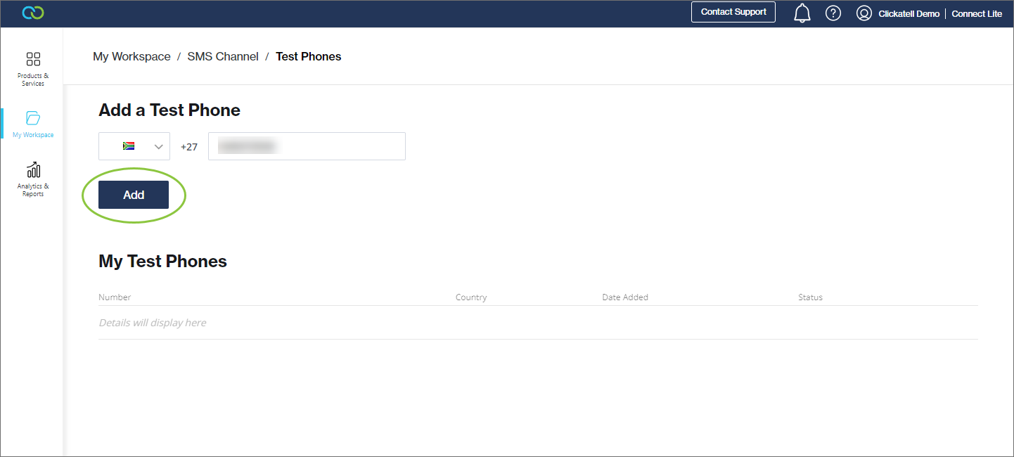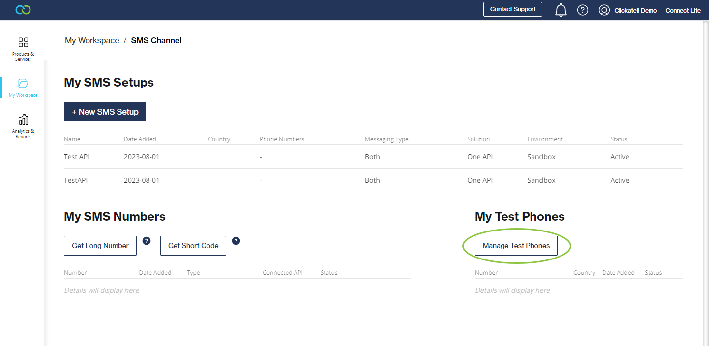 Test phones can also be set up as part of the [SMS setup wizard](https://guides.clickatell.com/sms-channel/getting-started/add-new-sms-setups-self-serve).​