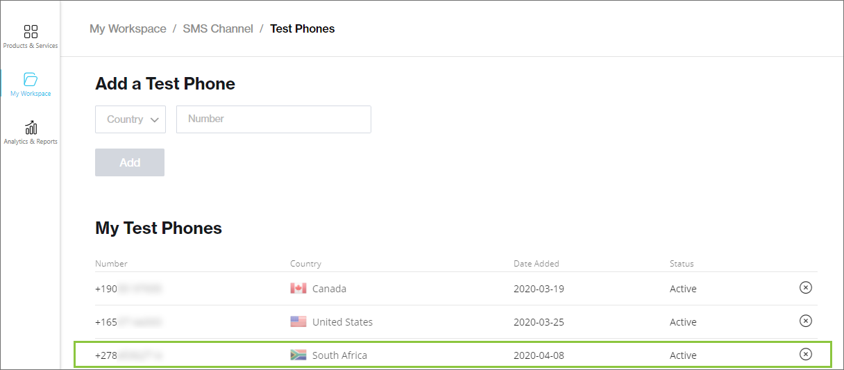 If the test phone number has not been verified successfully, it will have a status of **Unverified**. You cannot use this number and have to remove it before trying to add it again.