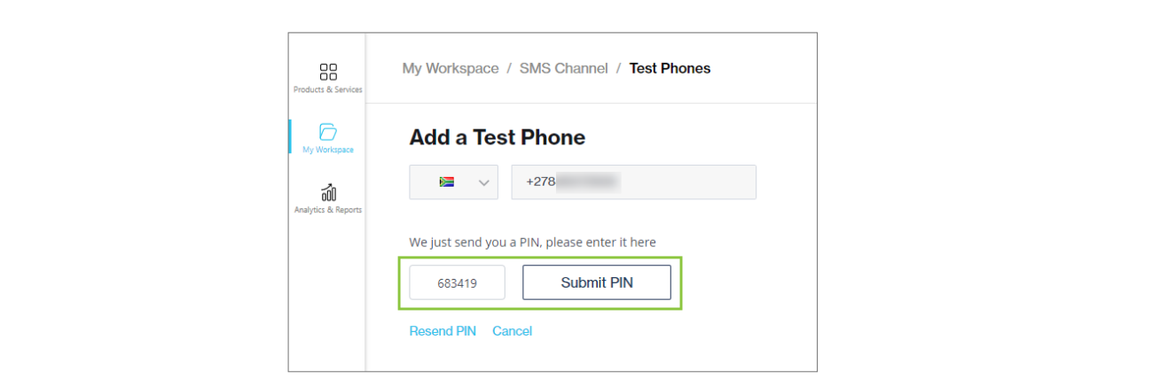 3. Select the country this phone number is registered in and add the number of the test phone (**in international format**).