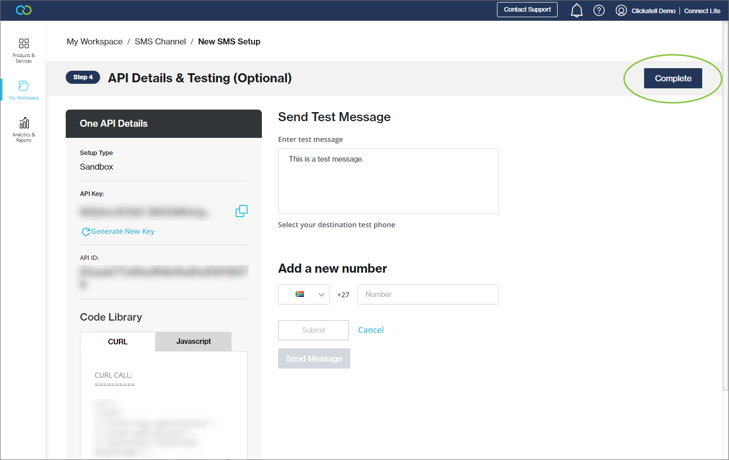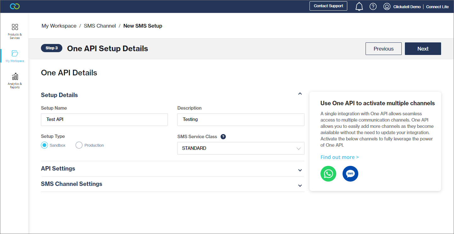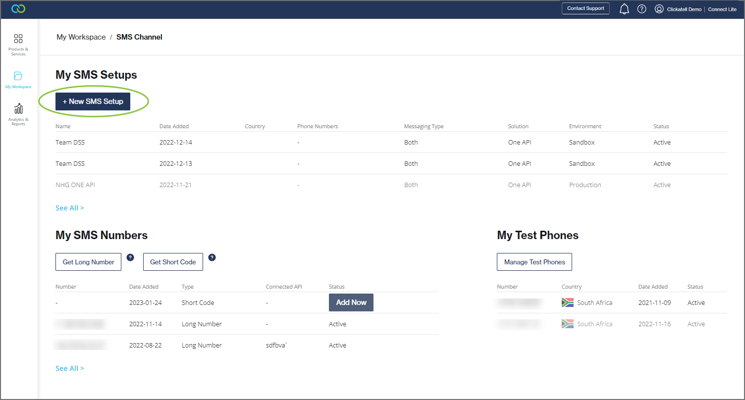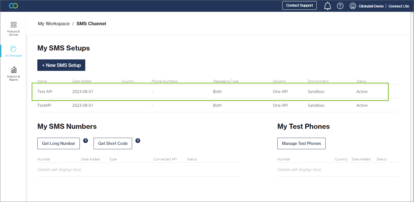 * Your new SMS Setup is added to the [*My SMS Setups*](https://guides.clickatell.com/sms-channel/getting-started/edit-and-test-sms-setups) table and is visible on the[ *API Integrations*](https://clickatell.gitbook.io/chat-commerce-platform/navigation-and-access/user-portal/view-and-edit-api-integrations) page.