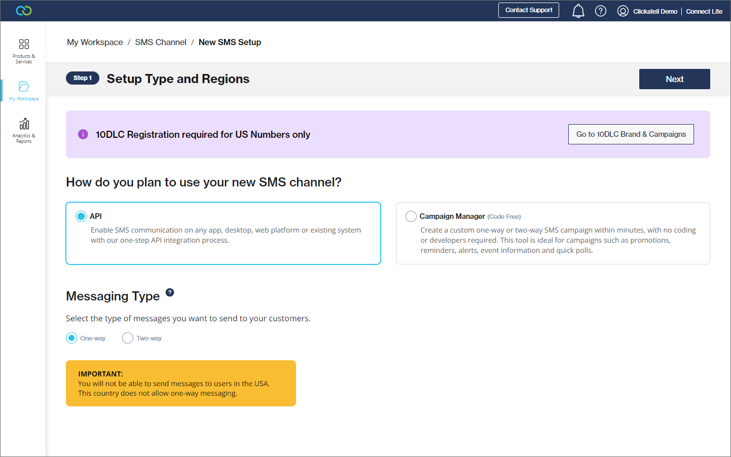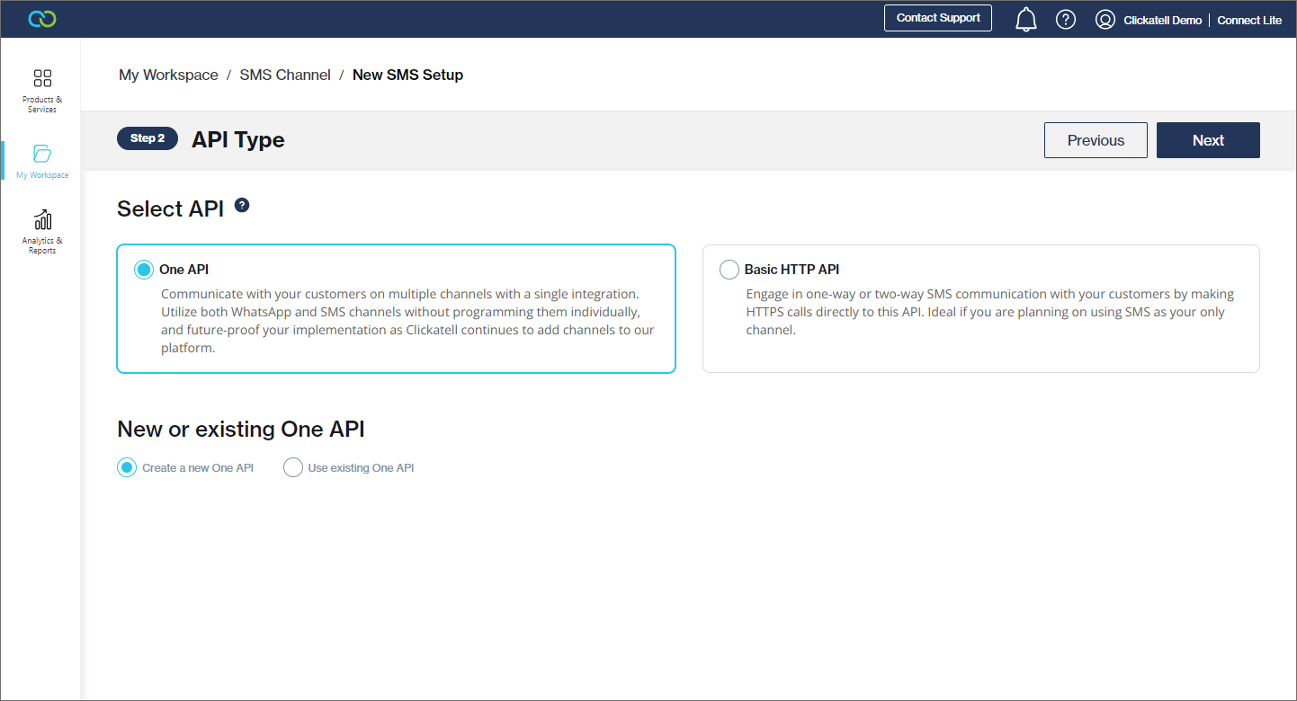 * **Via API:** You're prompted to select either the [**1-way**](https://guides.clickatell.com/sms-channel/1-way-sms-communication) (sending only) or [**2-way**](https://guides.clickatell.com/sms-channel/2-way-sms-communication) (sending & receiving) messaging type.