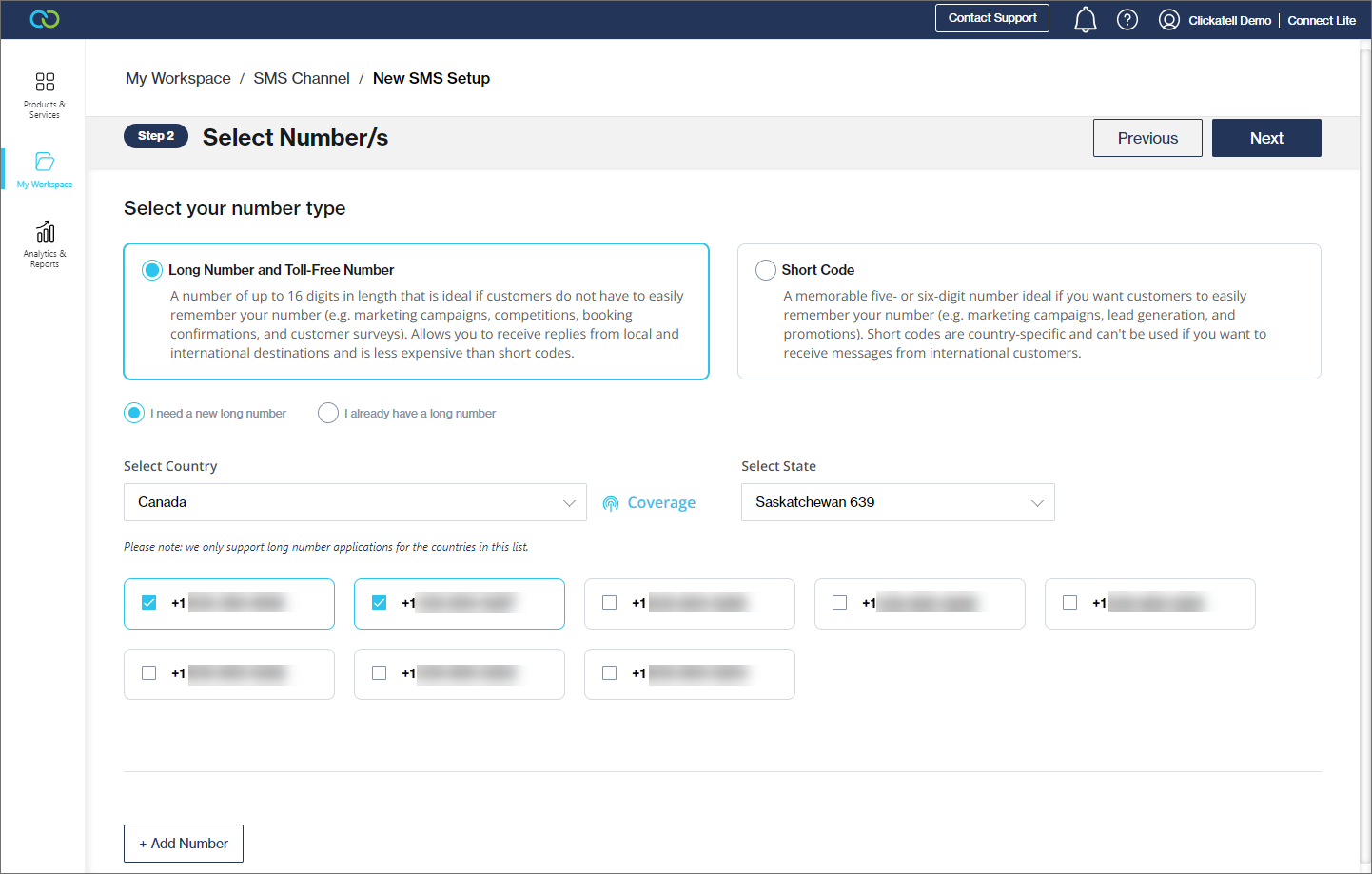 Since short codes require an application process and are not available immediately, we recommend you [**apply for a short number** ](https://guides.clickatell.com/sms-channel/short-codes)before adding a new SMS setup if you plan on using a short code for your SMS communications.