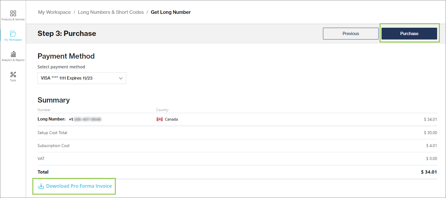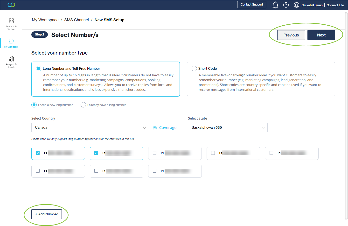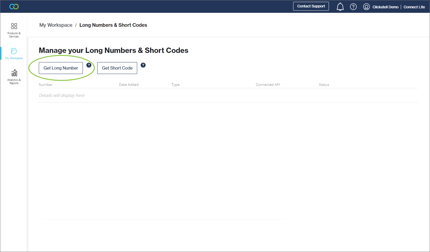 * Alternatively, navigate to *My Workspace --> SMS* and click the *Get Long Number* button under *My SMS Numbers*.