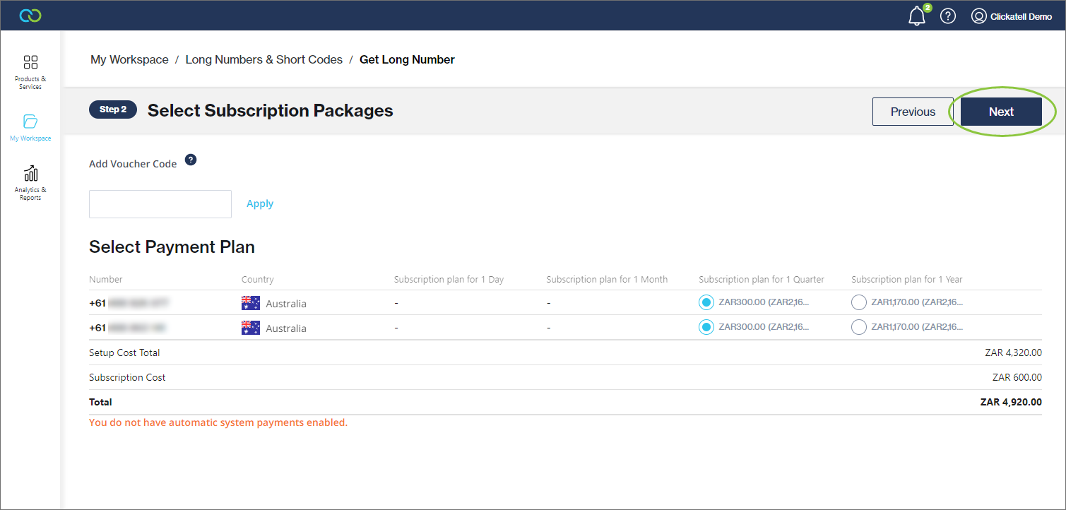 1. Go to *My Workspace -> Long Numbers & Short Codes ->* *Get Long Number.*