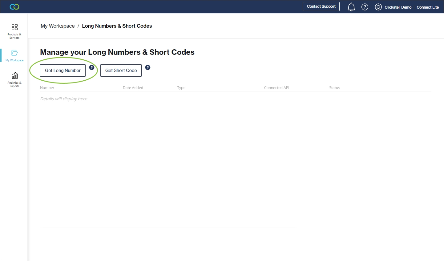 Alternatively, navigate to My Workspace --> SMS and click the Get Long Number button under My SMS Numbers.