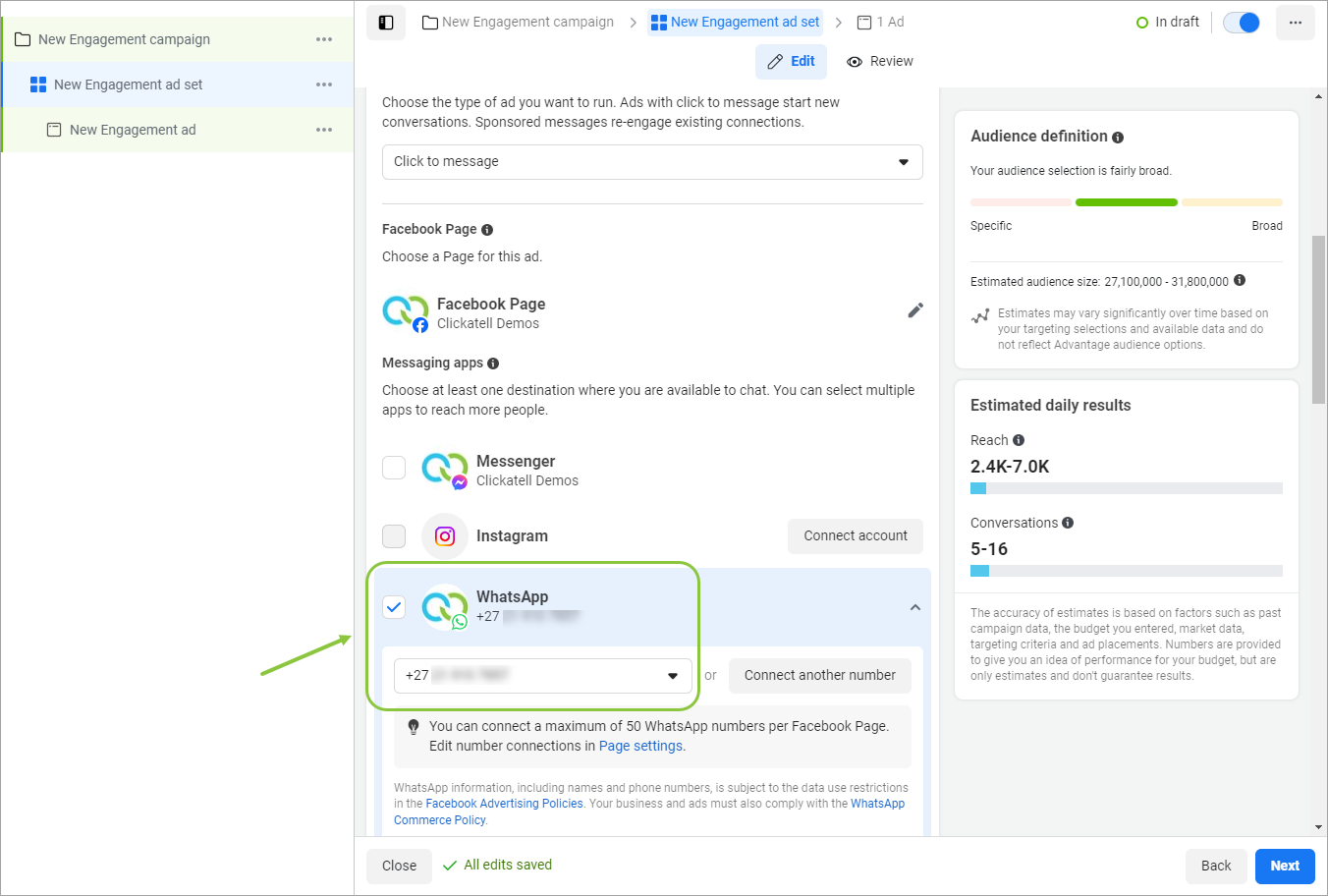 Scroll down and select "WhatsApp" as the destination app. Select the phone number connected to your page where you want to direct customers to continue the conversation when they click on the button in the ad.