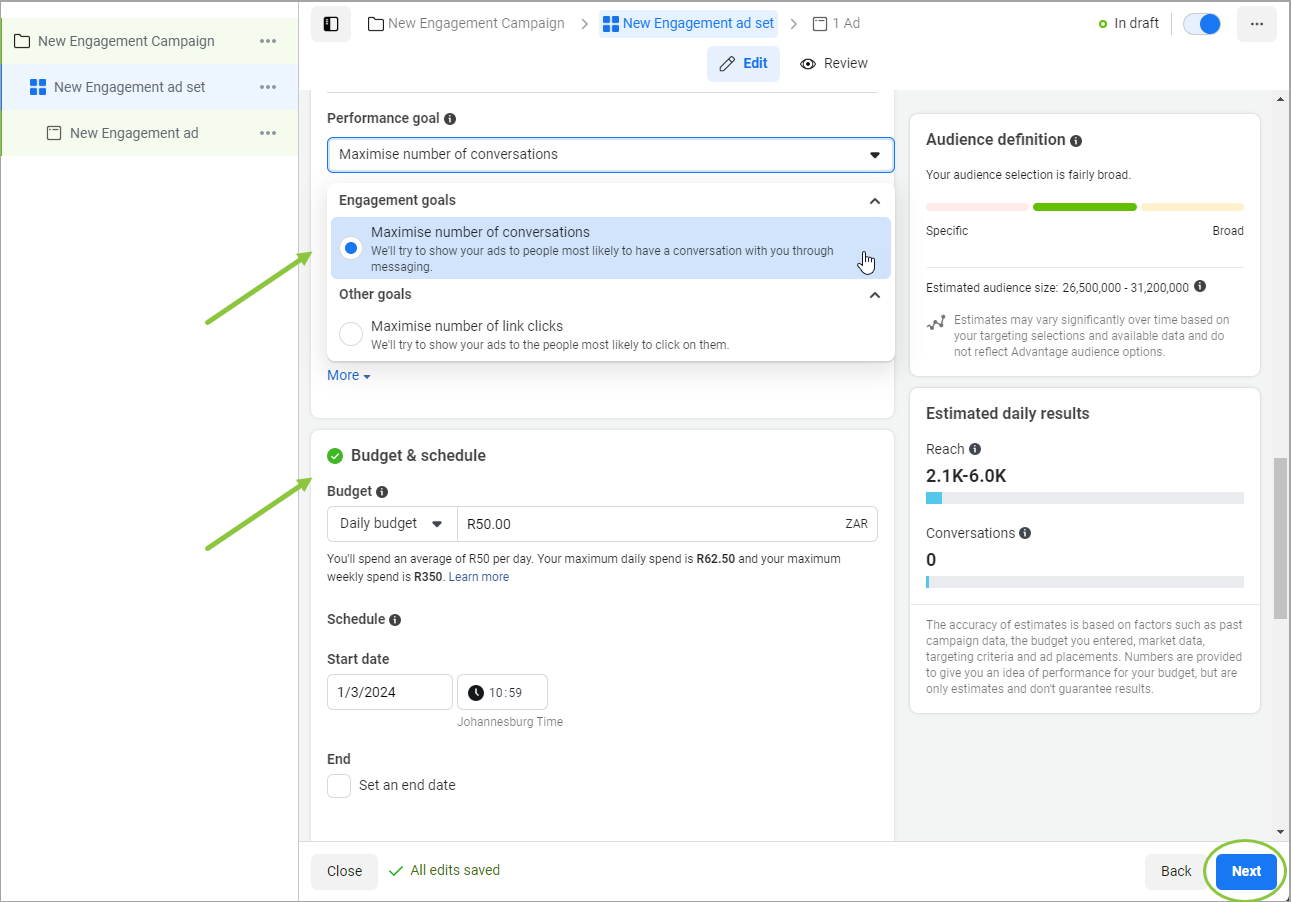 Choose your engagement goal. Set the budget, schedule, and audience for your ad set. Click Next.