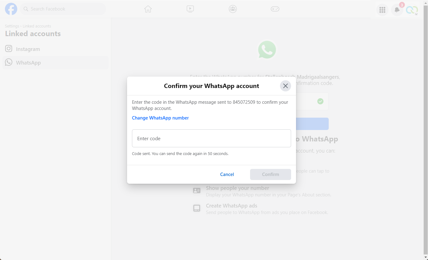 You'll receive a confirmation code via WhatsApp on the number you've entered above. Enter the code and click Confirm. Your WhatsApp account is now connected to your Facebook Page.