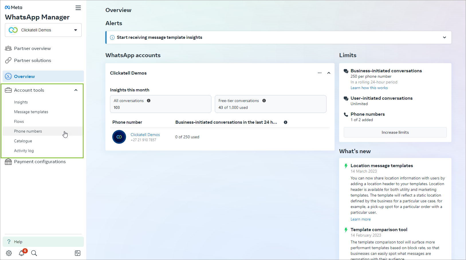 Hover over the Account Tools (suitcase) icon in the left panel and select Phone Numbers.