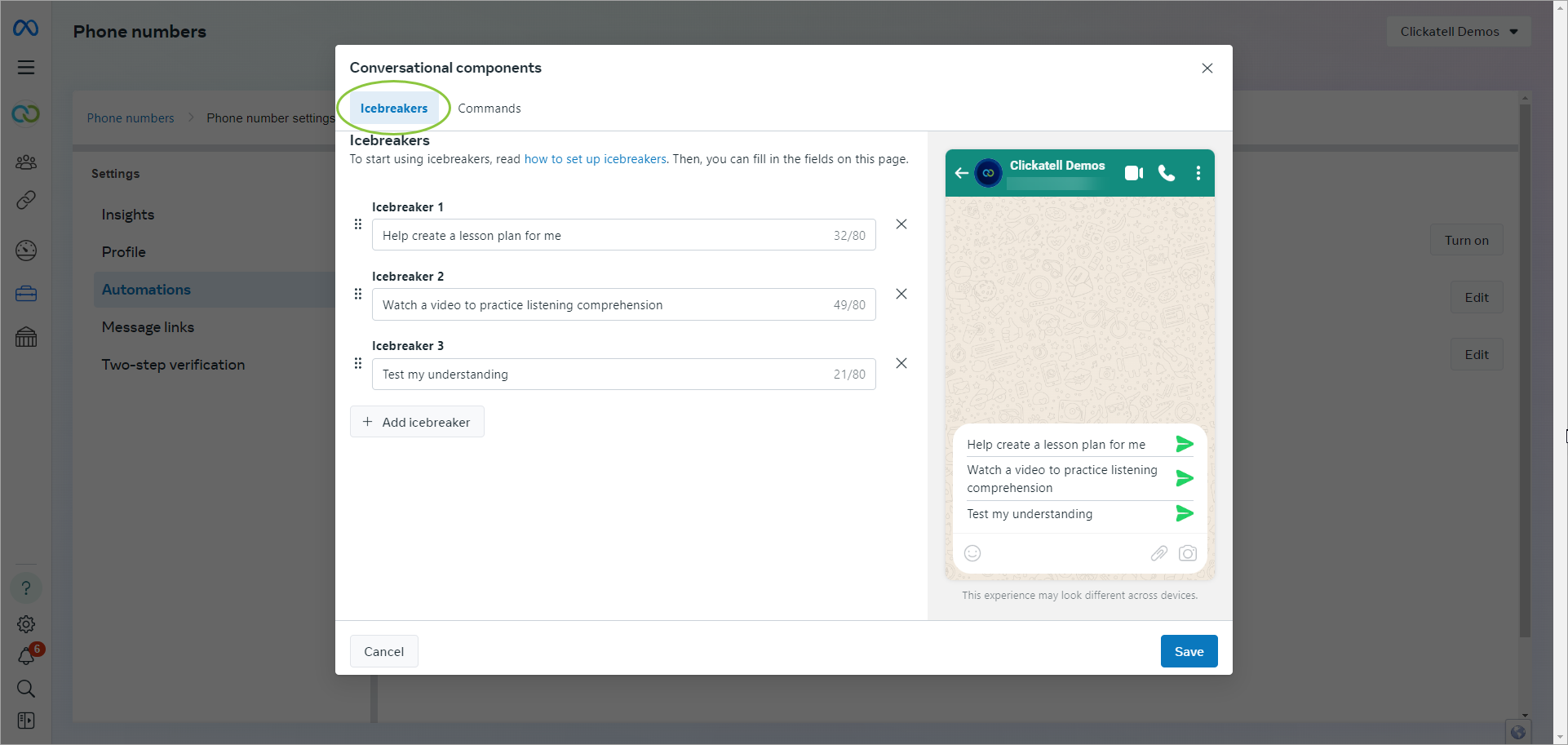 Your icebreakers and commands can now be used by your customers. You can return to these screens and edit your conversational components at any time.