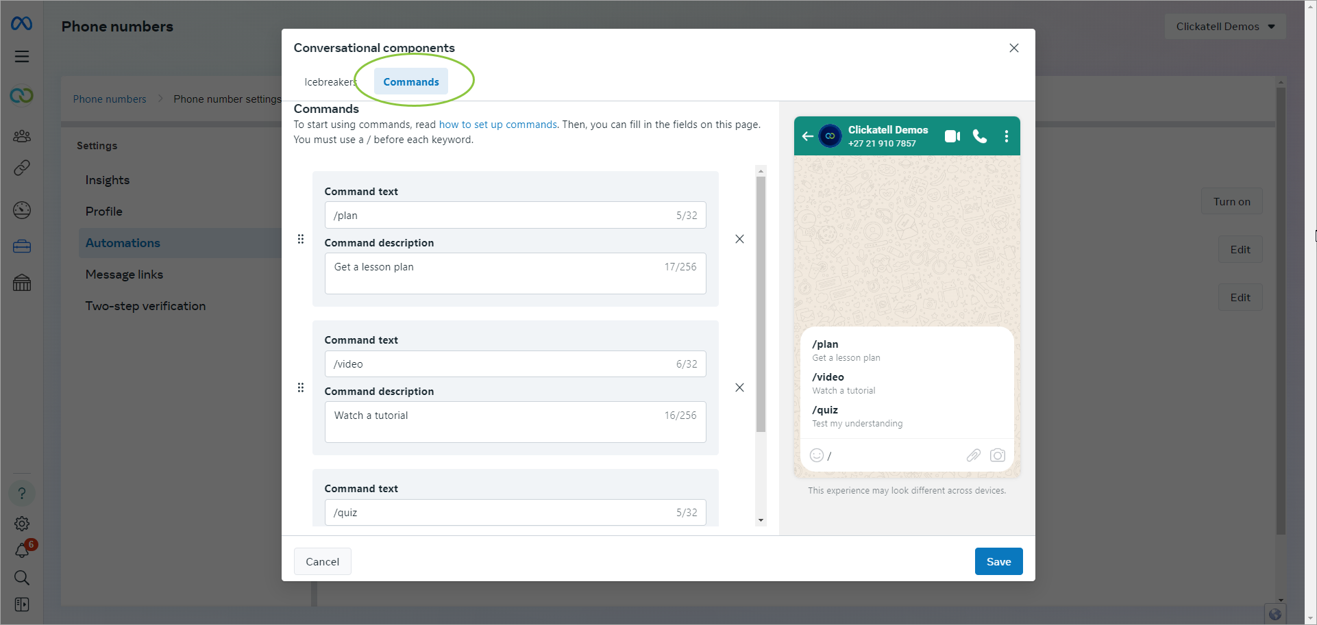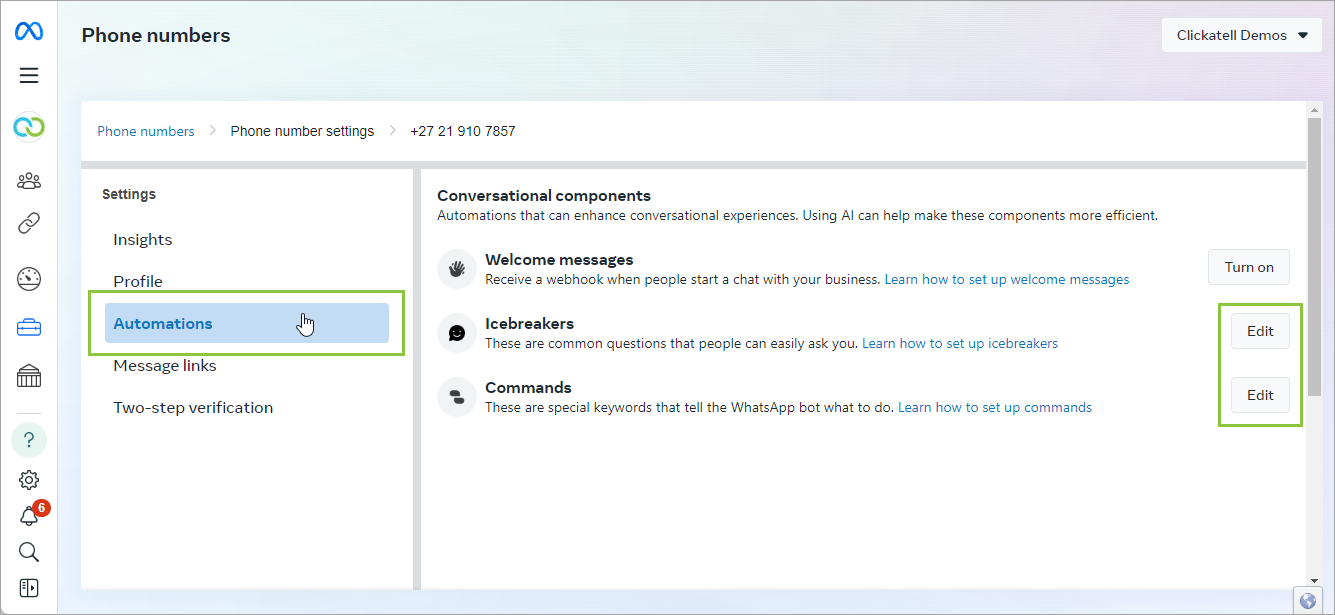 Select Automations and then select Edit for either Ice Breakers or Commands.