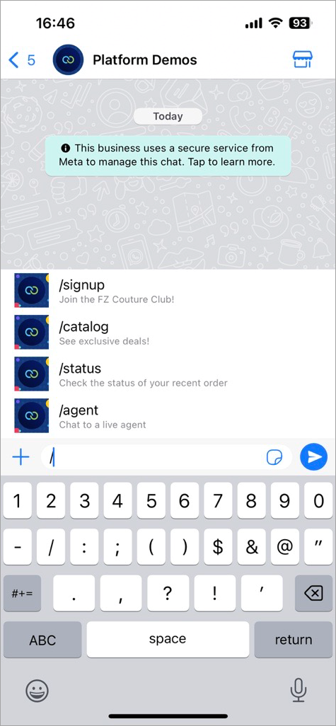 You can configure easy-to-use commands that your WhatsApp customers can see by typing a forward slash (/) in a message thread with your business. This can be used at any point during the conversation.