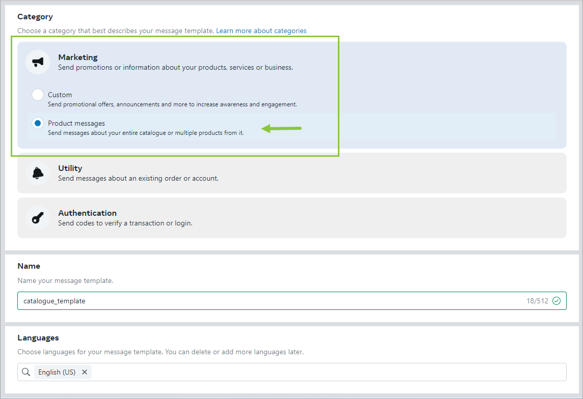 When creating your template in Facebook Business Manager, select Marketing -> Product messages as the category.