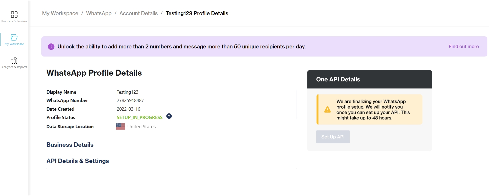 Note that, although you can start using your API, you are limited to the following until your business is verified: