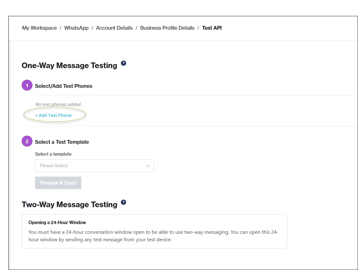 Select one or more of your test numbers, select a template from the drop-down, and click the Send One-Way Test Message button (This test environment only supports text templates. You cannot use templates with headers, footers, media, and buttons).